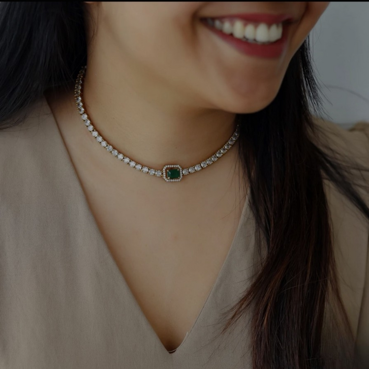 Premium Hasli AD kundan Choker Necklace golden set with green beads and pearl drops