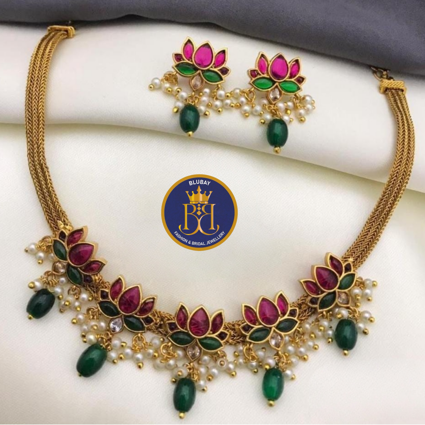 Thamara lined Lotus addigai mesh Necklace set with pearls and golden beads